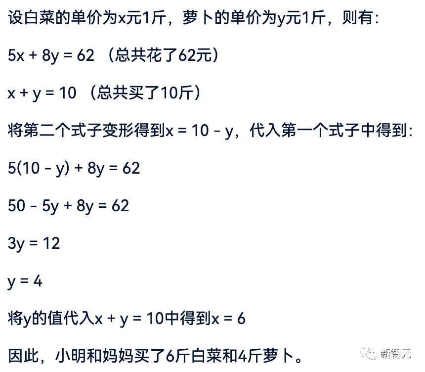 小明和妈妈去市场从而买菜,已知白菜5元1斤,萝卜8元1斤,总共买了10斤白菜和萝卜,花了62元,那么白菜和萝卜各买了多少斤?
