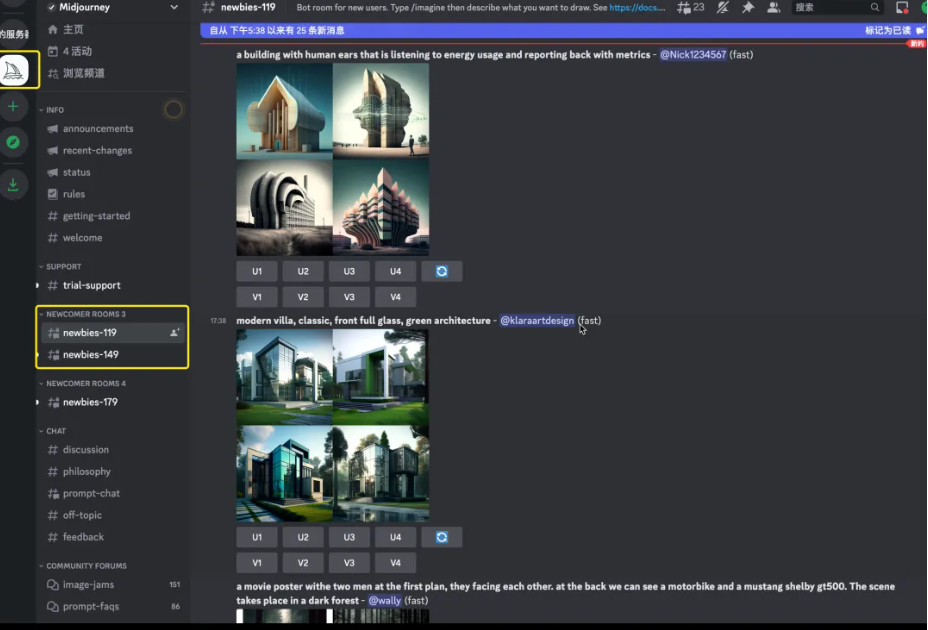 - 我们点击最左侧小组分栏中的帆船图标进入Midjourney小组,再点击左侧栏中newbies开头的任意频道,可以看到已经有很多朋友已经在作图了!