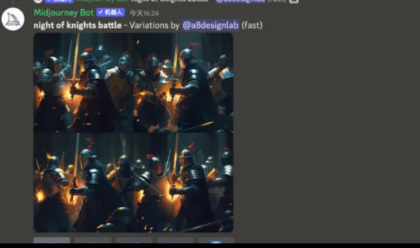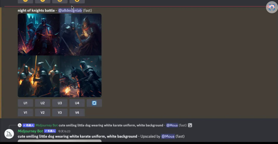 - 可以看到有四张图正在迅速显现。如果觉得其中一张不错可以点击u(upscale)提高画质细节或是v(variations)以该图为基准变化出不同版本。