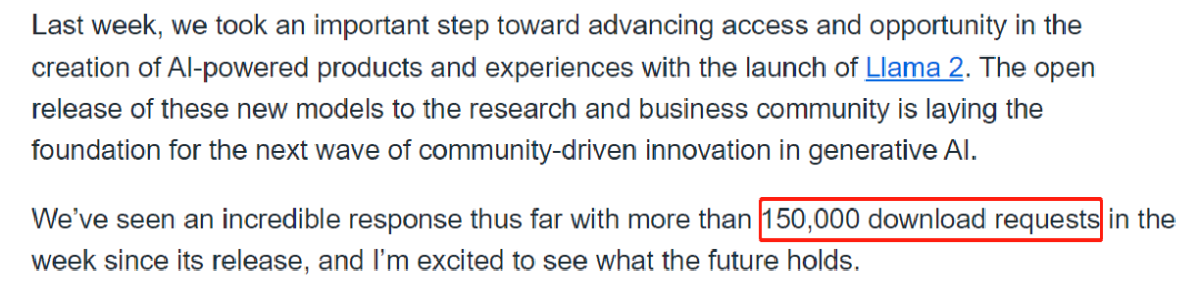 不同于 ChatGPT、GPT-4 等闭源模型,由于 Llama 2 可用于商业目的,一经发布就吸引了一大波 AI 研究人员的注意。由于任何人都可以通过在 Meta 网站上填写表格来请求下载 Llama 2,根据官方消息,自发布以来,Llama 2 一周内就有超过 15 万次的下载请求。Meta 对于这一数字的描述是难以置信,并且用户请求数量还在增长。