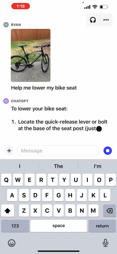 OpenAI 宣传视频中的画面,ChatGPT 在分析用户照片以帮助其调整自行车座高。