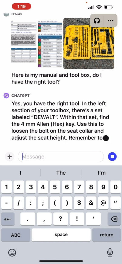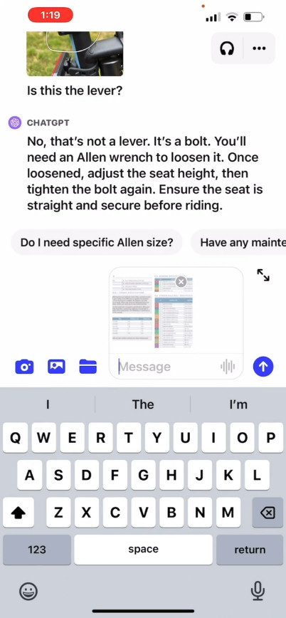 在官方网站上,OpenAI 发布了一段宣传视频(https://openai.com/blog/chatgpt-can-now-see-hear-and-speak),展示了与 ChatGPT 的交流过程。其中用户询问要如何升高自己的自行车座垫,并上传了车辆、说明手册以及工具箱的照片。ChatGPT 迅速做出反应,并为用户提供了完成调整过程的说明。我们还没有亲自测试过此功能,因此不太清楚实际效果是否真有这么惊艳。