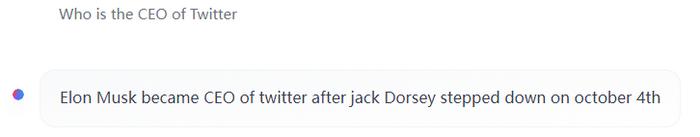 当然,与所有文本生成模型一样,HuggingChat 生成的回答是随机的,可能会出现错误或者虚假信息。例如,当我们询问推特的 CEO 是谁,它只答对了一半:伊隆・马斯克的确是现任 CEO,但上一任 CEO 并不是 Jack Dorsey。