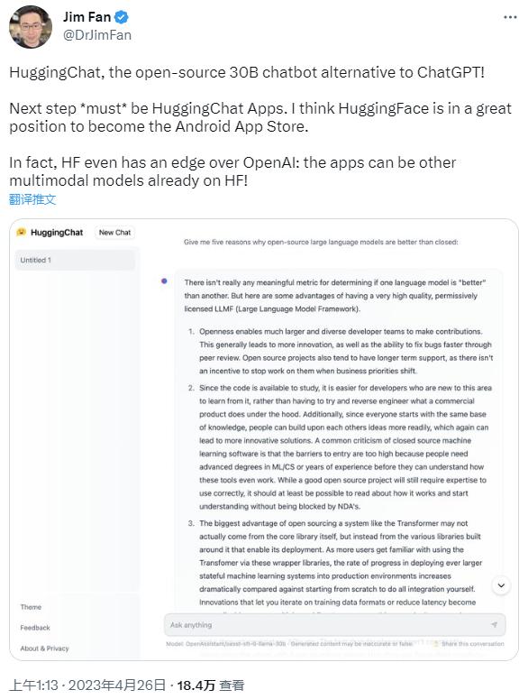 英伟达 AI 科学家 Jim Fan 称赞道:「HuggingChat 是 ChatGPT 的开源替代品」,并表示「如果后续开发成应用程序,Hugging Face 比 OpenAI 更具优势」。